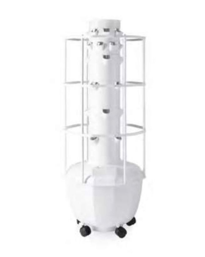 El depósito de Tower Garden® pulveriza la mezcla de nutrientes y agua hacia la parte superior a través de un tubo central. Cuando la solución llega a la parte de arriba de la torre va cayendo de manera uniforme en forma de lluvia de nutrientes, aportando todo lo que las raíces de las plantas necesitan para su crecimiento.