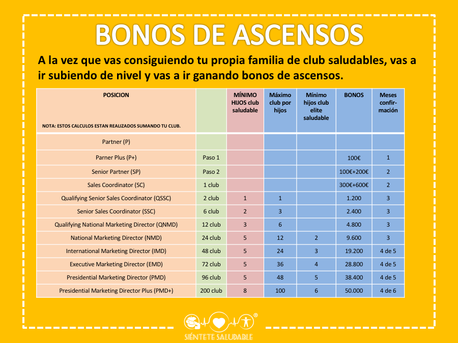 Esta comisión de club saludable, también llamada PB, es la mas importante de la compañía. Solo por ser club saludable puedes ganar el 2% de todos los pedidos de tus hijos y el 3% de tus nietos y bisnietos que estén en la posición de Partner Plus o superior. En el caso que uno de ellos no sea club saludable, bajamos a la siguiente posición de tataranietos, trastataranietos…..hasta que tengamos 3 miembros de nuestra familia que sean club saludable. Ej Si tu hijo, nieto y bisnieto es club saludable (2.000 Puntos reales) ganas 40€ de tus hijos y 60€ de tus nietos y bisnietos.