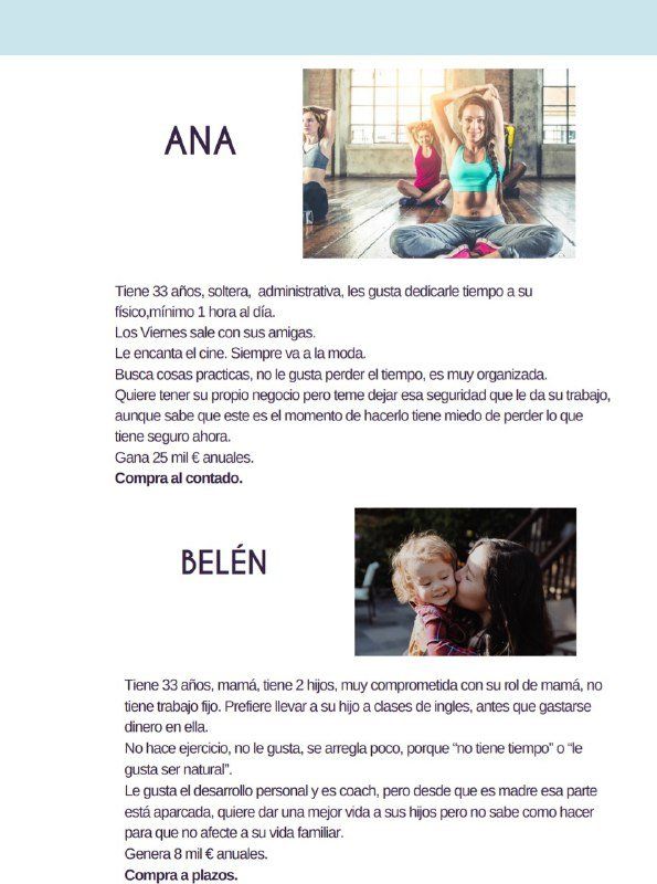 Tú tienes que conocer a tu clienta. Tú vas a construir una historia teniendo en cuenta estos 4 temas .