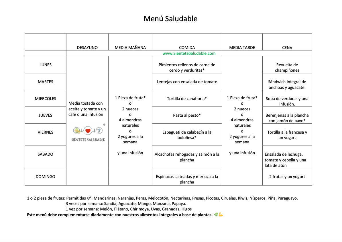 Aquí os dejamos la recomendación de un menú saludable para esta semana. Es un menú para que te sirva de guía, pero puedes cambiar un alimento por otro si te apetece. No te pierdas el vídeo que se encuentra en el apartado cambios de alimentos donde te explico personalmente como puedes hacerlo. Mira los cambios que quieras hacer y coméntaselo a tu asesora, para saber que están haciendo correctamente el cambio Espero que te guste y compartas tus platos en el grupo de Facebook. Os esperamos por allí