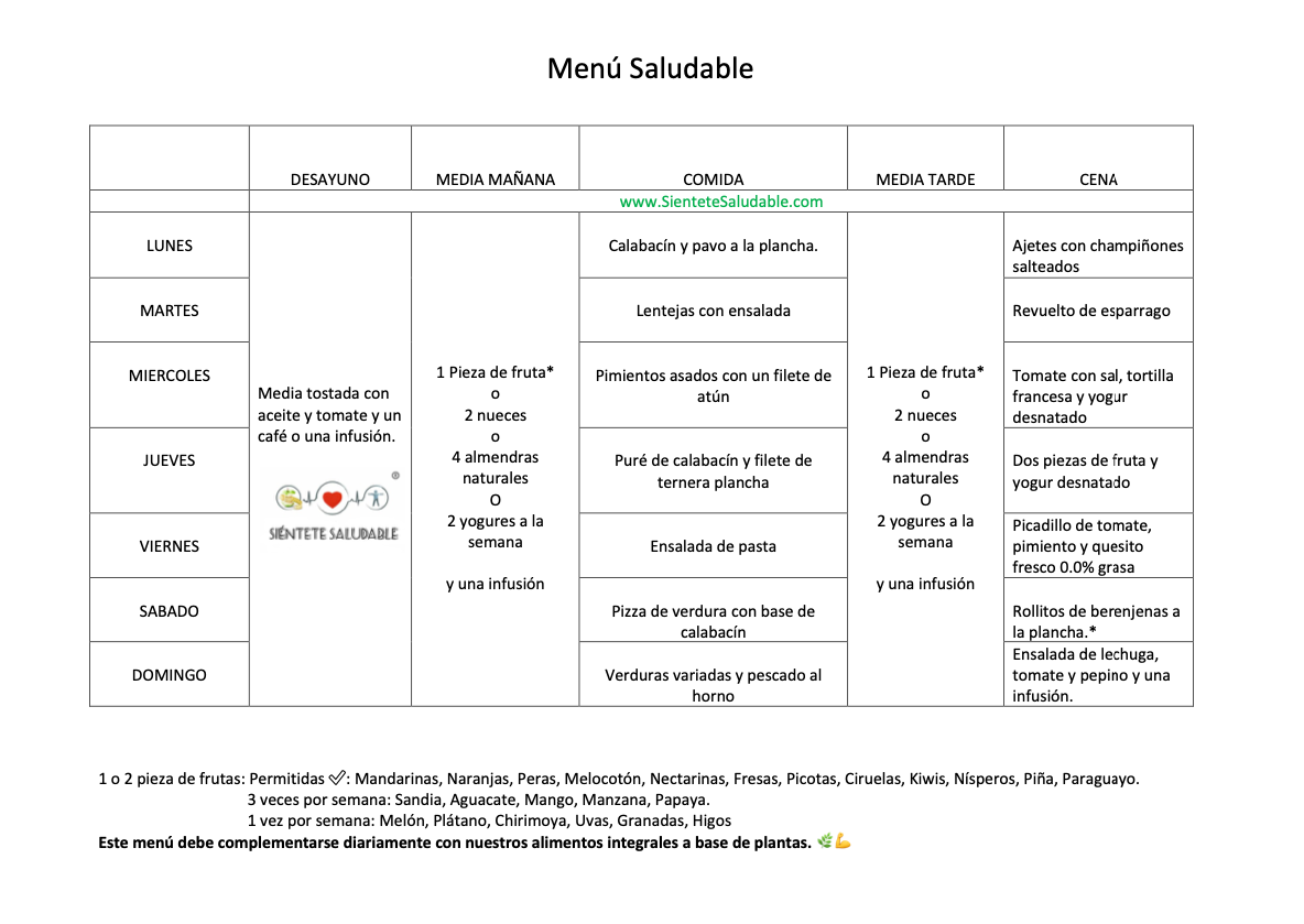 Aquí os dejamos la recomendación de un menú saludable para esta semana. Es un menú para que te sirva de guía, pero puedes cambiar un alimento por otro si te apetece. No te pierdas el vídeo que se encuentra en el apartado cambios de alimentos donde te explico personalmente como puedes hacerlo. Mira los cambios que quieras hacer y coméntaselo a tu asesora, para saber que están haciendo correctamente el cambio Espero que te guste y compartas tus platos en el grupo de Facebook. Os esperamos por allí