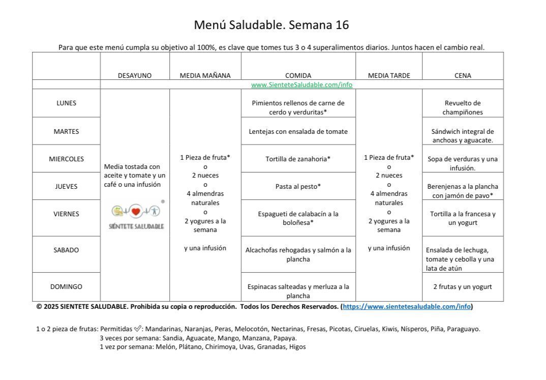 Aquí os dejamos la recomendación de un menú saludable para esta semana. Es un menú para que te sirva de guía, pero puedes cambiar un alimento por otro si te apetece. No te pierdas el vídeo que se encuentra en el apartado cambios de alimentos donde te explico personalmente como puedes hacerlo. Mira los cambios que quieras hacer y coméntaselo a tu asesora, para saber que están haciendo correctamente el cambio Espero que te guste y compartas tus platos en el grupo de Facebook. Os esperamos por allí