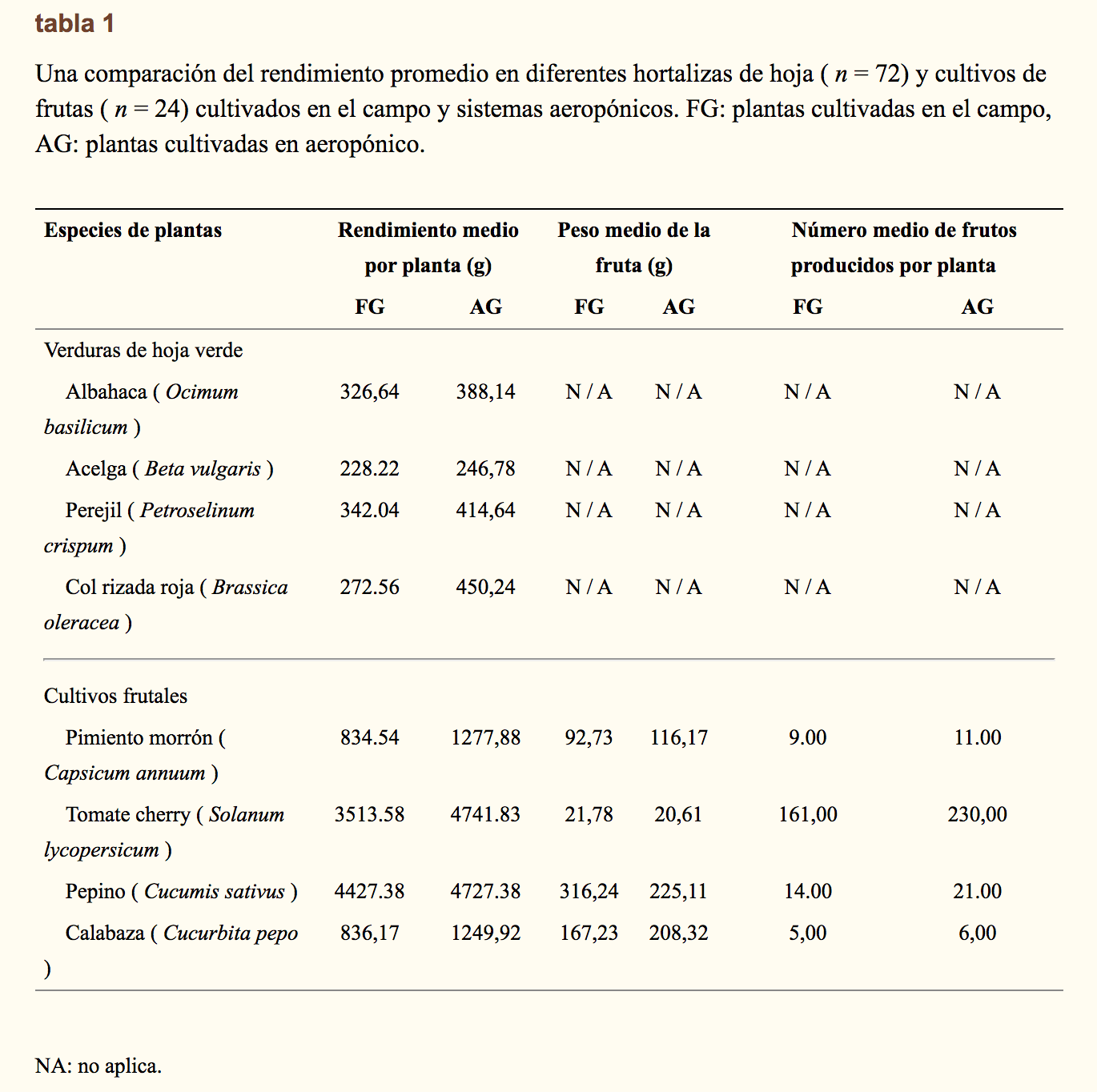 Se midió el peso fresco de cada cosecha hasta la cosecha final y se calculó el rendimiento total al final de la temporada para cada cultivo. Con base en el rendimiento total, el número de plantas propagadas y el número de frutos producidos, el rendimiento medio por planta, el número medio de frutos por planta y el peso medio del fruto se calcularon para cada cultivo cultivado en los sistemas aeropónicos Tower Garden. y en el campo.