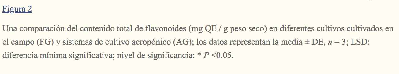 El contenido total de flavonoides en diferentes cultivos en sistemas aeropónicos y en campo se muestra en Figura 2. Entre las verduras de hoja, la mayor cantidad de contenido de flavonoides se encontró en el perejil (14,35 mg de equivalente ácido de quercetina (QE) / g de peso seco en FG y 13,00 QE / g de peso seco en AG) seguido de acelgas (11,08 mg QE / g seco en FG y 12,41 QE / g de peso seco en AG), albahaca (12,27 mg QE / g en FG y 9,91 QE / g de peso seco en AG) y col rizada (6,57 mg QE / g de peso seco en FG y 10,69 QE / g peso seco en AG), mientras que en cultivos frutales, el contenido de flavonoides fue el más alto en pimiento morrón (4,11 mg QE / g peso seco en FG y 3,70 QE / g peso seco en AG) seguido por pepino, tomate y calabaza. Las diferencias en el contenido de flavonoides en cultivos aeropónicos y cultivados en el campo, albahaca (LSD = 8.35, P <0.05), acelgas (LSD = 11.19, P <0.05), perejil (LSD = 13.04, P <0.05), col rizada (LSD = 9,63, P<0.05), pimiento morrón (LSD = 2.56, P <0.05), tomates cherry (LSD = 0.88, P <0.05), pepino (LSD = 1.60, P <0.05) y calabaza (LSD = 0.76, P <0.05) se observó que eran estadísticamente insignificantes. Similar al contenido fenólico, las verduras de hoja tenían un mayor contenido de flavonoides en comparación con los cultivos de frutas.
