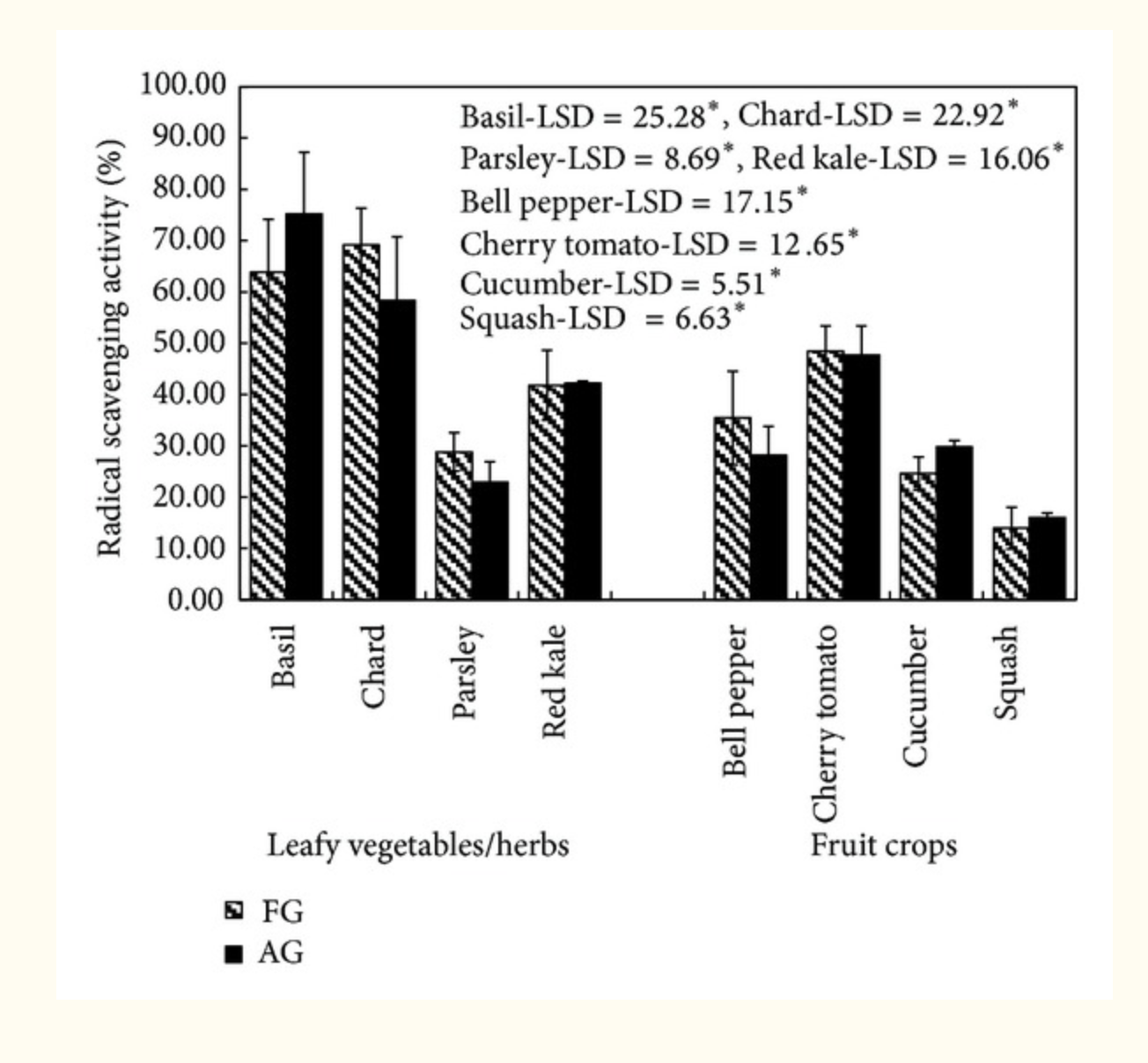 Las propiedades antioxidantes de los cultivos AG y FG utilizando el ensayo de 2,2-difenil-1-picrilhidrazilo (DDPH) se muestran en figura 3. Entre las verduras de hoja, la actividad antioxidante en términos de actividad captadora de radicales, utilizando el ensayo DPPH, osciló entre 63,88 y 28,80% en los cultivos de campo, mientras que osciló entre 75,22 y 22,91% en las plantas cultivadas en sistemas aeropónicos. La máxima actividad antioxidante se observó en la albahaca y la mínima en el perejil entre las verduras de hoja. En general, los valores de la actividad de eliminación de radicales fueron más bajos en los cultivos de frutas en comparación con los de las hortalizas de hoja. Entre los cultivos de frutas, la actividad osciló entre 48,47 y 13,93% en cultivos de campo, mientras que osciló entre 47,70 y 16,01% en los cultivos en sistemas aeropónicos. La actividad máxima se encontró en tomates cherry y la actividad mínima se observó en calabaza entre cultivos de frutas. Se encontró que la actividad de eliminación de radicales de los cultivos cultivados aeropónicamente es comparable a los cultivados en el campo. Sin embargo, las diferencias menores en la actividad de eliminación de radicales entre cultivos cultivados aeropónicamente y aquellos cultivados en el suelo fueron estadísticamente insignificantes (albahaca, LSD = 25.28; acelga, LSD = 22.92; perejil, LSD = 8.69; col rizada, LSD = 16.06; bellota). pimienta, LSD = 17.15; tomates cherry, LSD = 12.65; pepino, LSD = 5.51; calabaza, LSD = 6.63) (P <0,05).