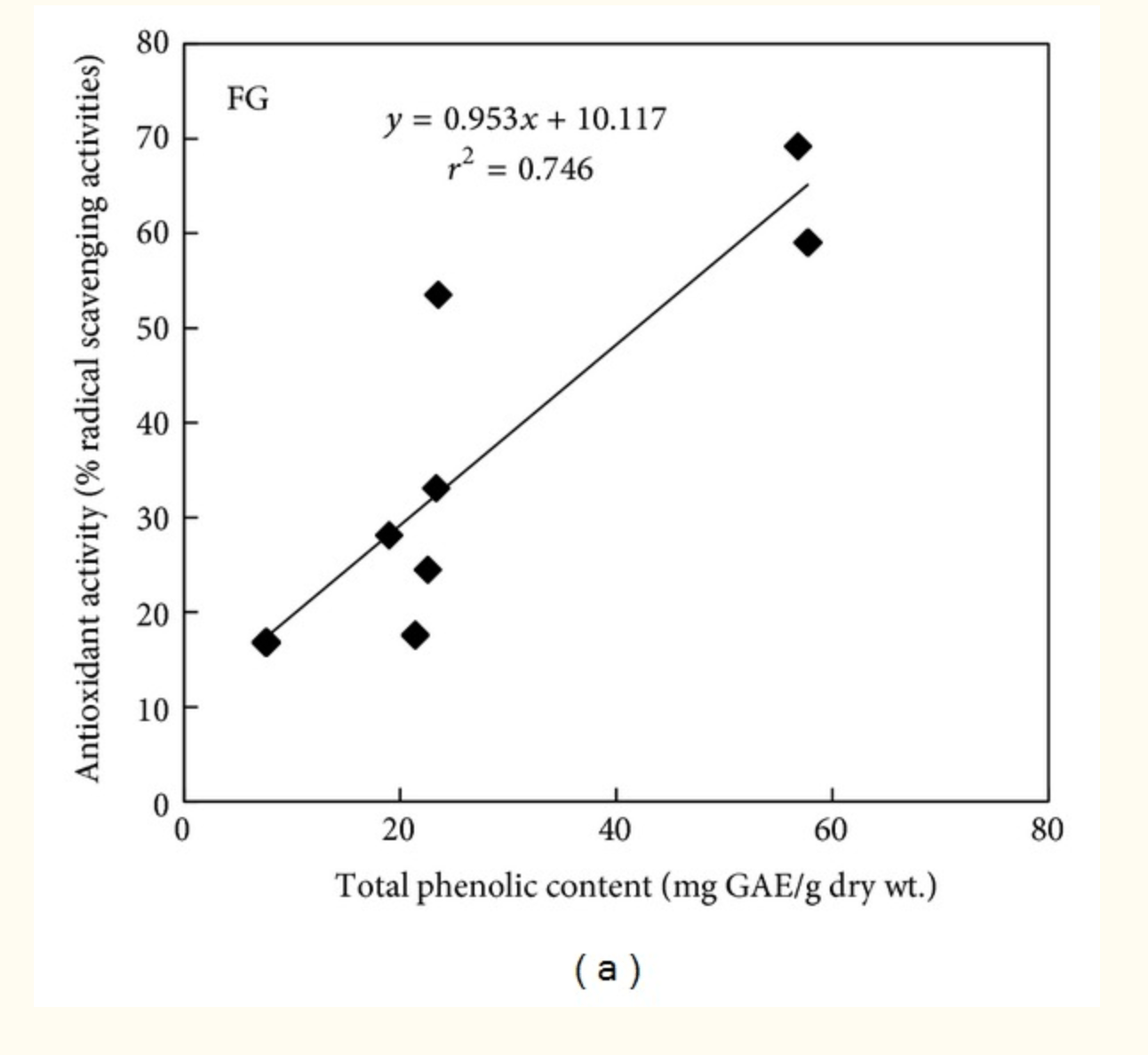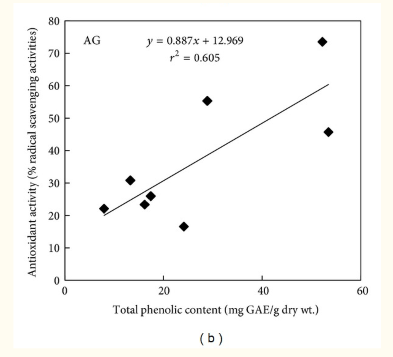 Figuras55 y y6,6, respectivamente. Después del ensayo DPPH, el análisis de regresión muestra que los compuestos fenólicos contribuyen a aproximadamente el 75% ( r 2 = 0,746, P <0,05) y el 61% ( r 2 = 0,605, P <0,05) de las propiedades de eliminación de radicales en los cultivos cultivados en el campo y en Tower Garden, respectivamente (Figura 5). De manera similar, los flavonoides contribuyen a aproximadamente el 30% ( r 2 = 0.299, P <0.05) y el 32% ( r 2 = 0.324, P <0.05) de la actividad antioxidante en los cultivos cultivados en el campo y en Tower Garden, respectivamente (Figura 6). Evidentemente, el resto de la proporción de actividad antioxidante proviene de compuestos no fenólicos como las vitaminas y los carotenoides [ 46 ]. Los fenólicos y flavonoides, en general, constituyen un grupo importante de compuestos, que actúan como antioxidantes primarios [ 47 ], y se sabe que reaccionan con radicales hidroxilo [ 48 ], radicales aniónicos superóxido [ 49 ] y radicales lípidos peroxi [ 50 ]. También se sabe que protegen el ADN del daño oxidativo, inhiben el crecimiento de células tumorales y poseen propiedades antiinflamatorias y antimicrobianas. Del mismo modo, Yao et al. 2010 [ 51] informó una correlación positiva significativa entre la actividad antioxidante y el contenido de flavonoides totales y fenoles totales en el apio. La mayor proporción de actividad antioxidante de los compuestos fenólicos en las especies cultivadas en sistemas aeropónicos y en el suelo en nuestro estudio puede usarse como una fuente accesible de antioxidantes naturales. Nuestros datos sugieren que, a pesar de algunas variaciones, las actividades antioxidantes de los cultivos de cultivo aeropónico fueron muy comparables a las que se cultivan en el suelo. Dado que las concentraciones de vitaminas y compuestos fenólicos en los productos agrícolas pueden verse influenciadas por la distribución desigual de nutrientes en el suelo, los sistemas hidropónico / aeropónico proporcionan un mayor nivel de reproducibilidad, que es un requisito previo si el producto se utiliza en la alimentación o nutracéutica. industria.