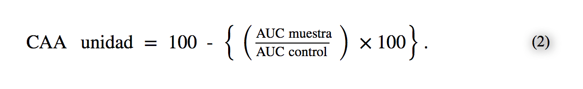 HepG 2 células (adquiridas de American Type Culture Collection, ATTC, Rockville, MD) se cultivaron en DMEM suplementado con 10% de FBS y antibióticos (penicilina 50 unidades / ml y 50 μ g / ml de estreptomicina). Para el ensayo, las células se sembraron en los pocillos de una placa de 96 pocillos a una densidad de 60.000 células / pocillo y se incubaron durante 24 horas. El medio se retiró y las células se lavaron con PBS antes de tratar con la muestra de ensayo (500 μ g / ml) diluido en el medio que contiene 25 μ M DCFH-DA durante 1 h. Después de retirar el medio, las células se trataron con 600 μM ABAP y la placa se colocaron inmediatamente en un lector de placas SpectraMax para la medición cinética cada 5 min durante 1 hora (37 ° C, emisión a 538 y excitación a 485 nm). Se utilizó quercetina como control positivo. La actividad antioxidante se expresó en términos de unidades CAA. El área bajo la curva (AUC) de la gráfica de fluorescencia frente al tiempo se utilizó para calcular las unidades de CAA como lo describen Wolfe y Rui [ 26 ]: